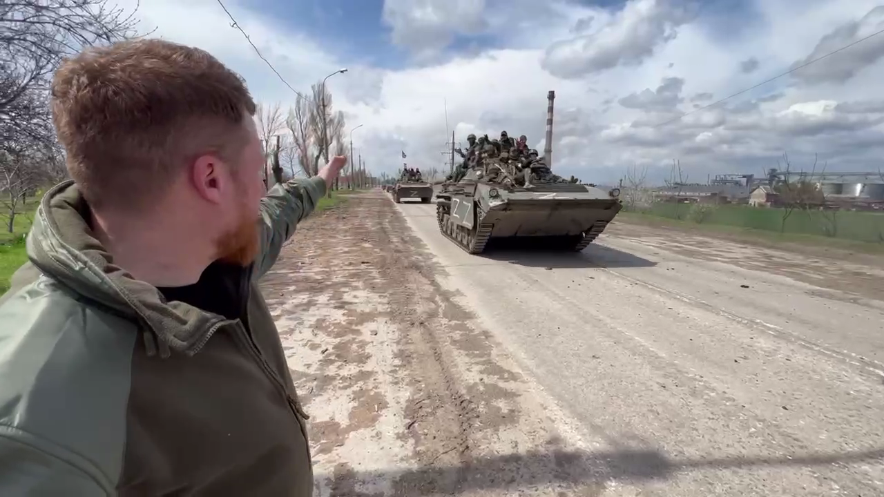 بث مراسل قناة "روسيا" التلفزيونية لقطات قال إنها للقوات الروسية وهي تتجه شمالا من ماريوبول للمشاركة في تطويق القوات الأوكرانية في دونباس..