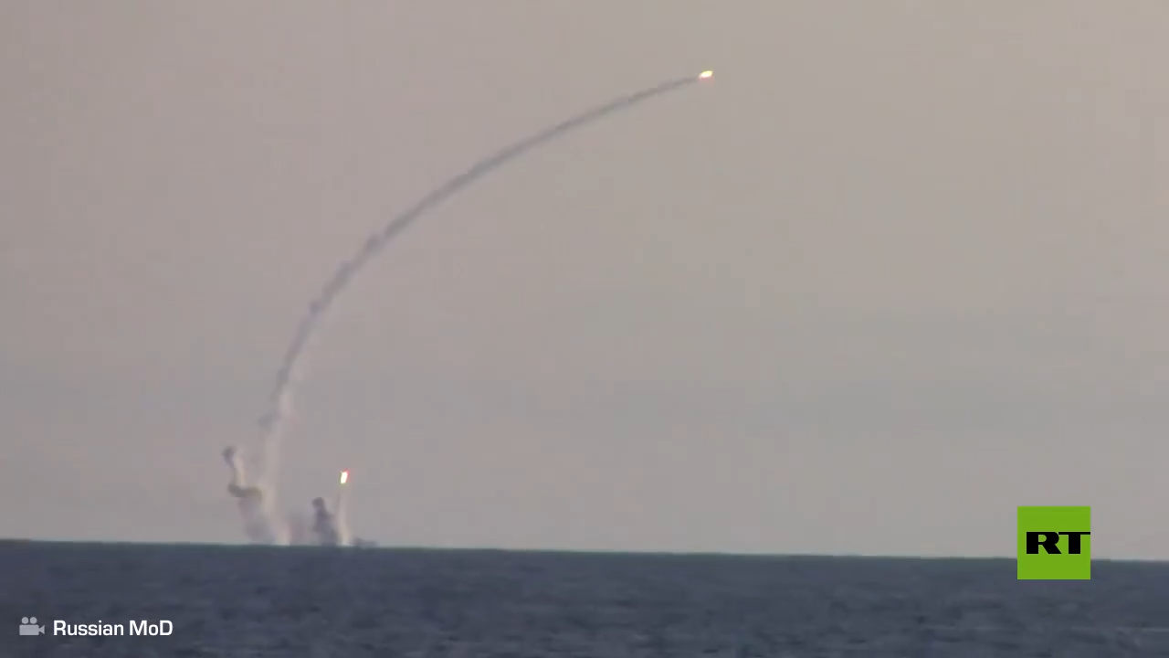 نشرت وزارة الدفاع الروسية شريط الفيديو يظهر إطلاق 4 صواريخ "كاليبر" المجنحة من البحر الأسود باتجاه منشأت البنية التحتية العسكرية الأوكرانية.