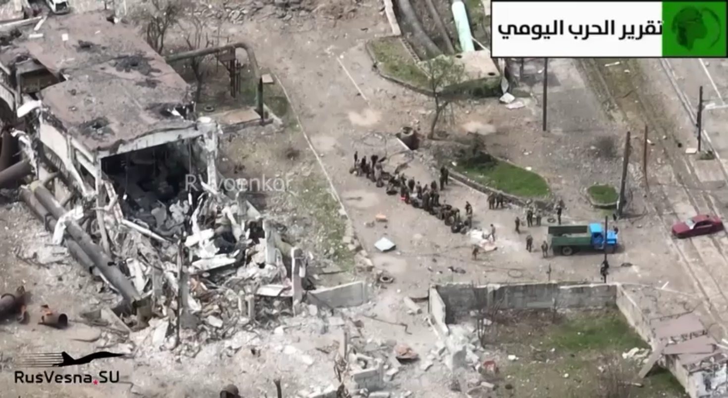 تصوير جوي يظهر توجه المسلحين الأوكرانيين من آزوفستال للاستسلام إلى الجيش الروسي