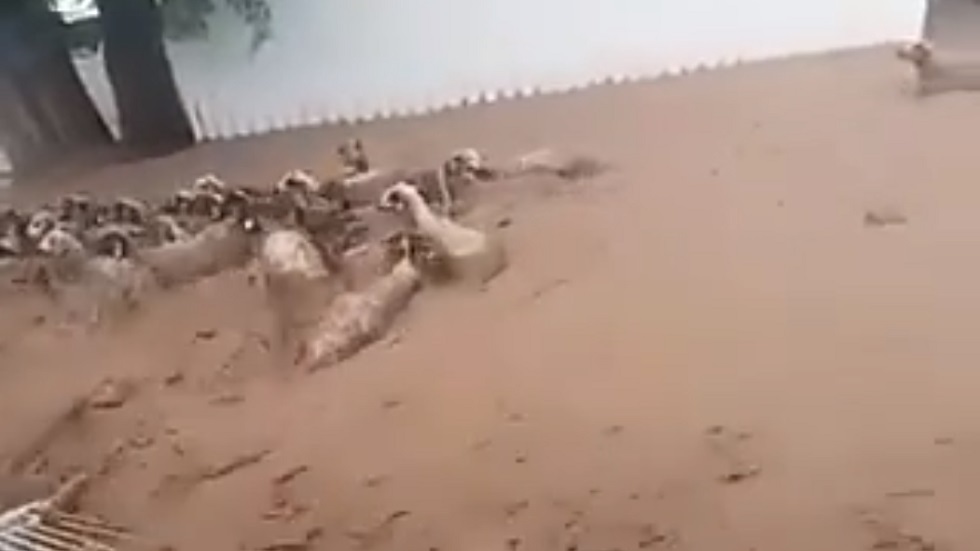 وترصد الكاميرا في الفيديو قطيعا كبيرا من الأغنام وقد جرفه السيل وحمله بلا هدى.