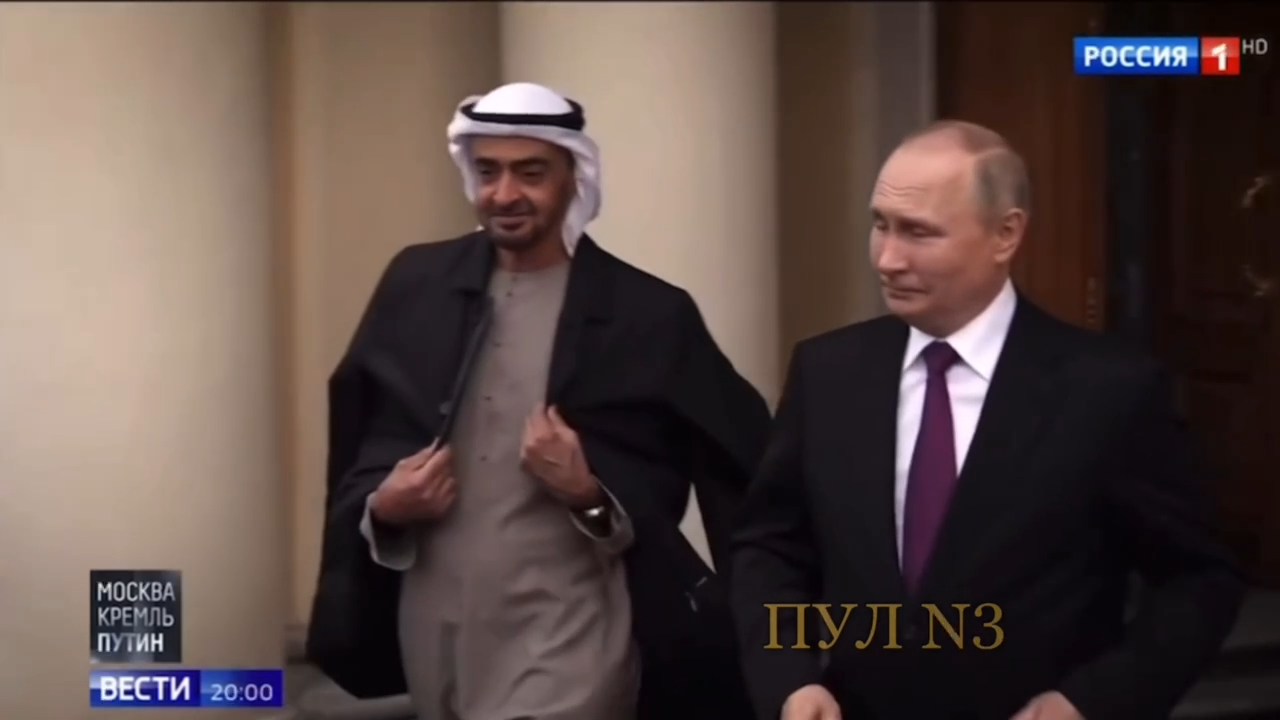 وفيما اتضح من مقطع الفيديو أن بن زايد خرج من محل لقاء الرئيسين وقد ارتدى معطفا، يبدو أنه لبوتين.