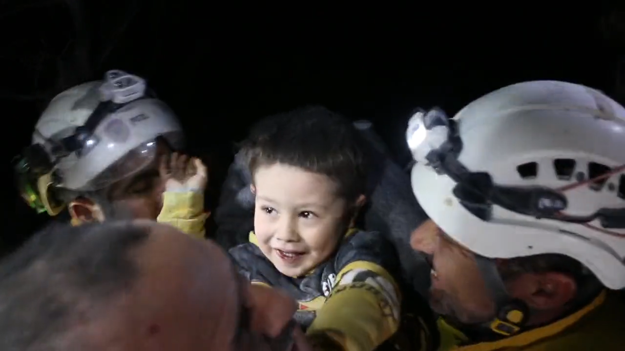 أخذ طفل سوري يدعى "كرم" يداعب من حوله من رجال الإنقاذ الذي أخرجوه من تحت الأنقاض في محافظة ريف إدلب شمال سوريا.