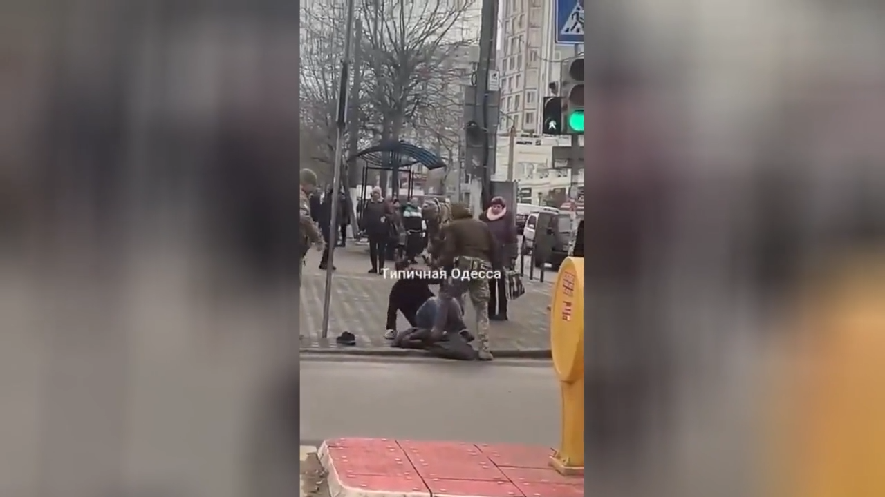 يوضح هذا الفيديو من مدينة أوديسا كيف يحاول المفوضون العسكريون تسليم أمر الاستدعاء لشخص ملقى بالفعل على الأرض.