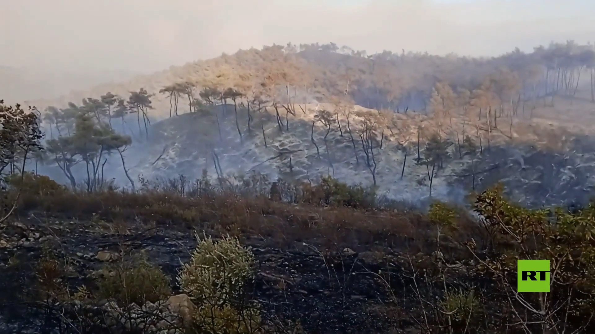 اندلعت حرائق الغابات في مدينة مشقيتا بريف اللاذقية الشمالي بسوريا وامتدت إلى الأراضي الزراعية ملتهمة كل شيء في طريقها.