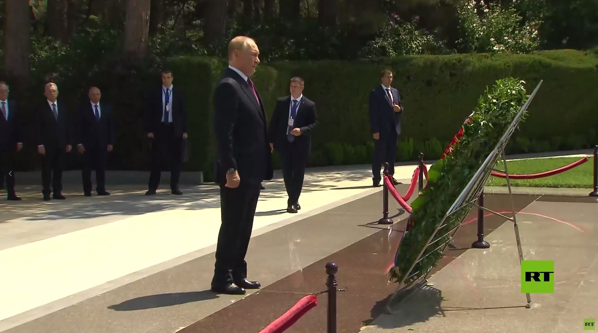 وضع الرئيس الروسي فلاديمير بوتين إكليلاً من الزهور على قبر رئيس أذربيجان الراحل حيدر علييف خلال زيارته إلى باكو.
