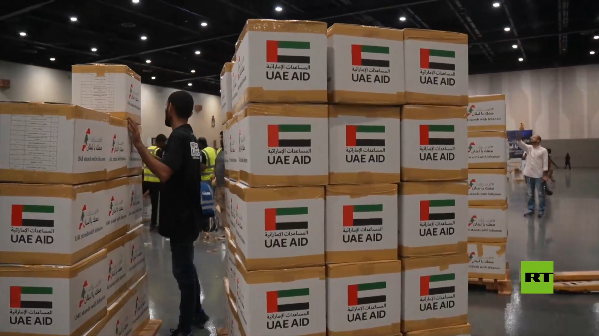 وقام المتطوعون بتجهيز صناديق المساعدات الإنسانية المخصصة للبنانيين داخل قاعة في "مدينة إكسبو دبي".
