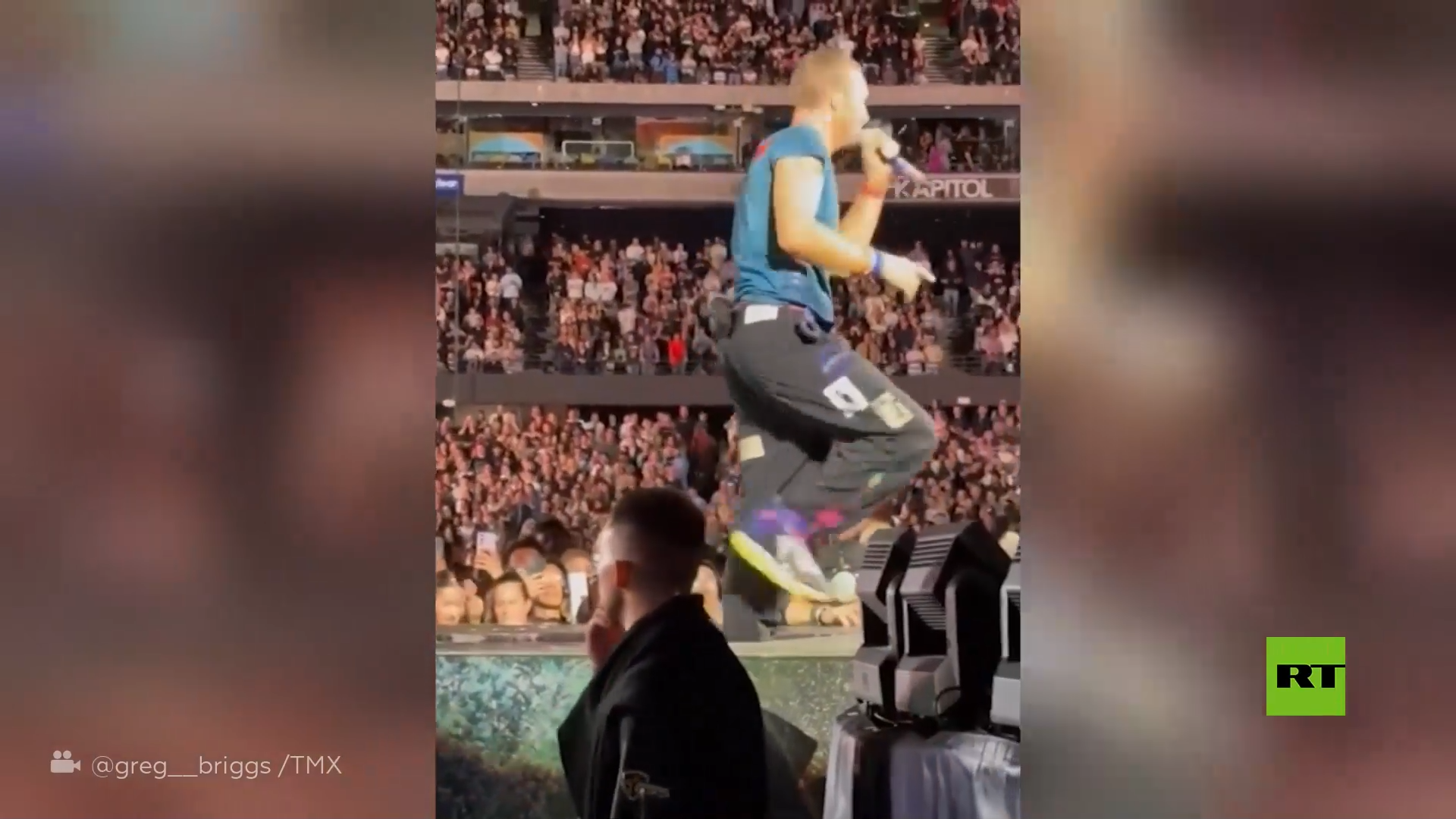 وتداولت مواقع التواصل الاجتماعي لقطات لكريس مارتن وهو يسير إلى الخلف قبل أن يسقط في باب سري حيث تمكن أحد أفراد الفرقة من الإمساك به.