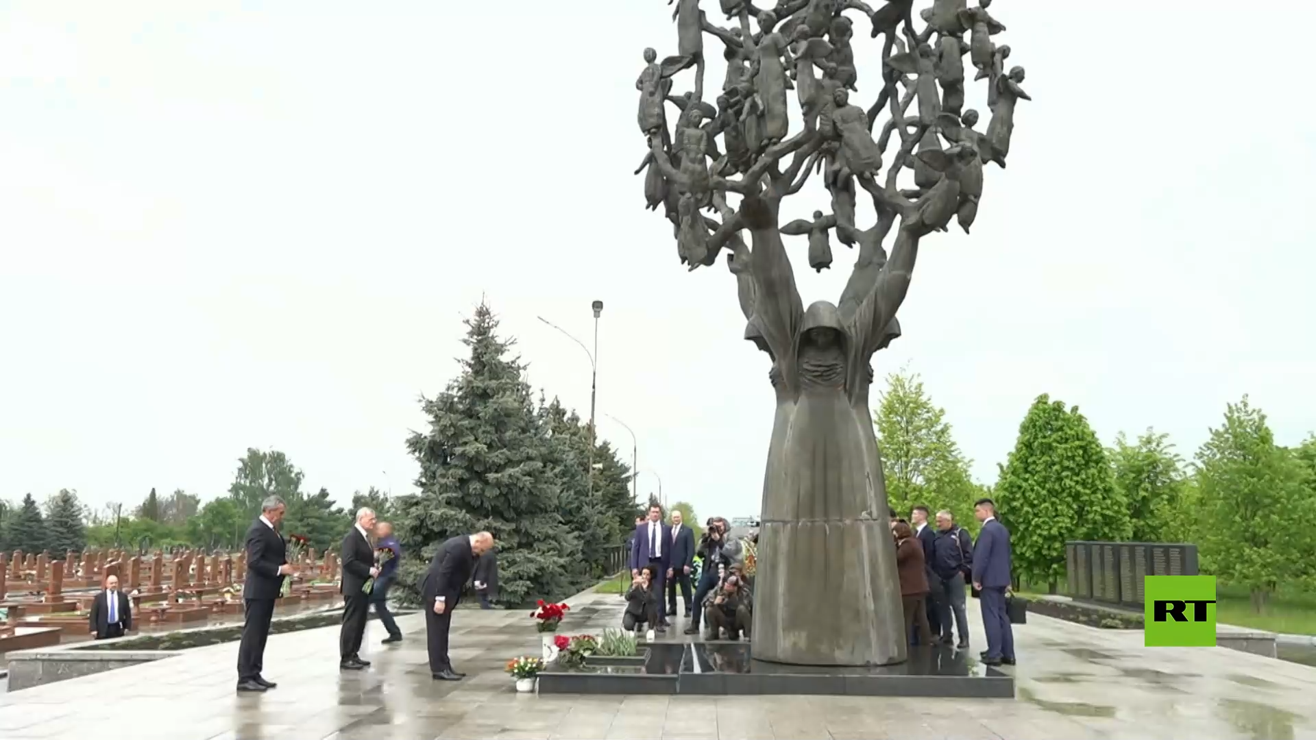 ميشوستين يضع باقة من الورود على النصب التذكاري للأطفال في بيسلان