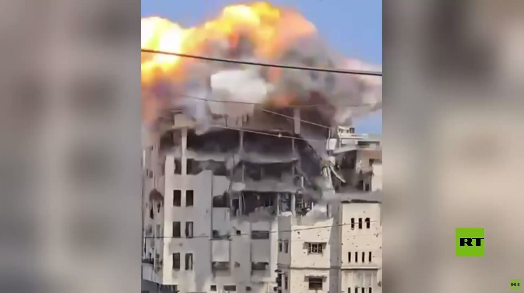 تظهر مشاهد متداولة اليوم لحظة استهداف الطائرات الحربية الإسرائيلية لمبنى يقع في شارع النصر غرب مدينة غزة.