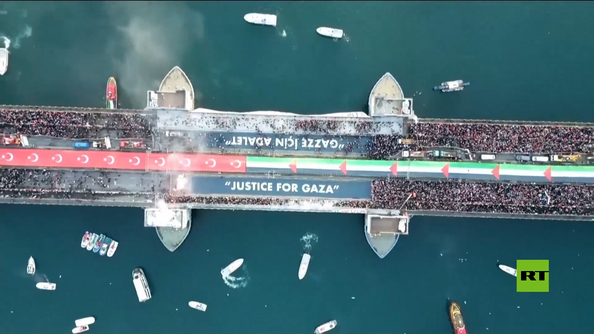 احتشد عشرات آلاف الأتراك عند جسر غالاطة بإسطنبول اليوم الخميس ملوحين بأعلام فلسطين وتركيا في مسيرة تضامنية مع فلسطين نظمها "تحالف الإنسانية" و"منصة الإرادة الوطنية".