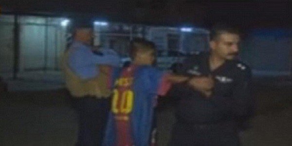 ويلاحظ الصبي وهو يرتدي قميص لاعب نادي برشلونة الإسباني، ليونيل ميسي، وهو يخفي الحزام الناسف الملفوف حول جسمه.