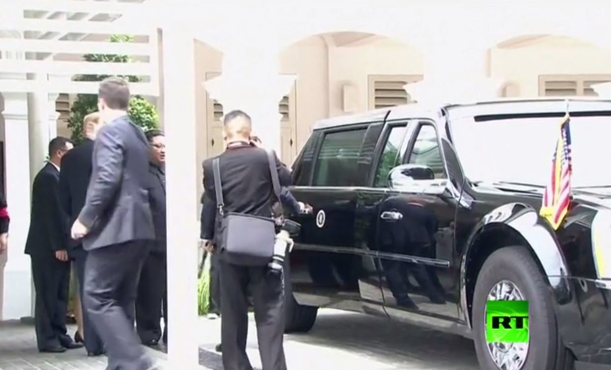 وخرج الزعيمان الأمريكي والكوري الشمال، بعد غذاء العمل، إلى الشارع وقام الحرس بفتح باب السيارة وبعد ذلك نظر كيم إلى ما في داخلها.