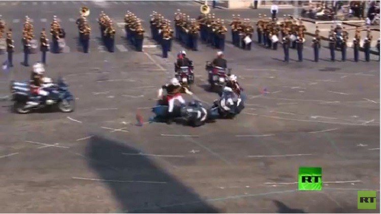 شهدت الاحتفالات بالعيد الوطني الفرنسي"سقوط الباستيل"، موقفا محرجا، تمثل في تصادم دراجتين ناريتين وسقوطهما أثناء عرض بحضور الرئيس إيمانويل ماكرون.