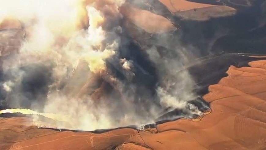 بث التلفزيون المحلي في ولاية أوريغون الأمريكية شريط فيديو يظهر حريقا هائلا اندلع قرب مدينة داليس نتج عن وفاة سائق جرار.