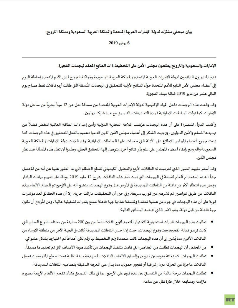 اعتبرت السعودية والإمارات والنرويج أن الطابع المعقد لهجمات الفجيرة التي استهدفت 4 ناقلات، يتطلب قدرات استخبارية، وغواصين مدربين على إلصاق الألغام، ودرجة عالية من التنسيق والتخطيط.