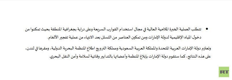 وقدمت الدول الثلاث يوم أمس الخميس إحاطة لمجلس الأمن الدولي اتهمت فيها دولة لم تسمها بالوقوف وراء هذه التفجيرات التي قالت إنها عرضت الملاحة التجارية الدولية وإمدادات الطاقة العالمية للخطر فضلا عن تهديدها للأمن والسلم الدوليين.