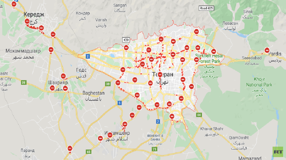 وتبين الخريطة أن جميع الطرق الرئيسة في العاصمة مغلقة، وهو نفس حال الطرق المؤدية لطهران من الغرب.
