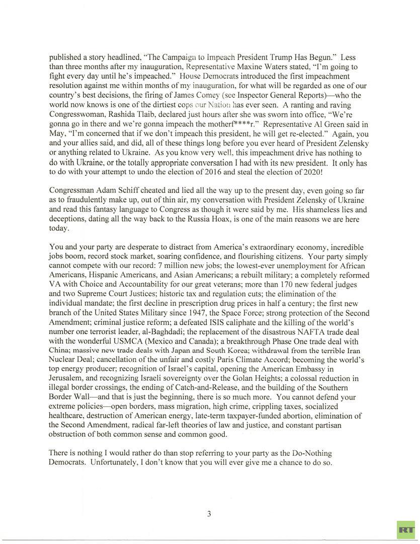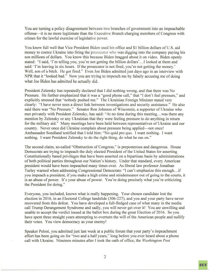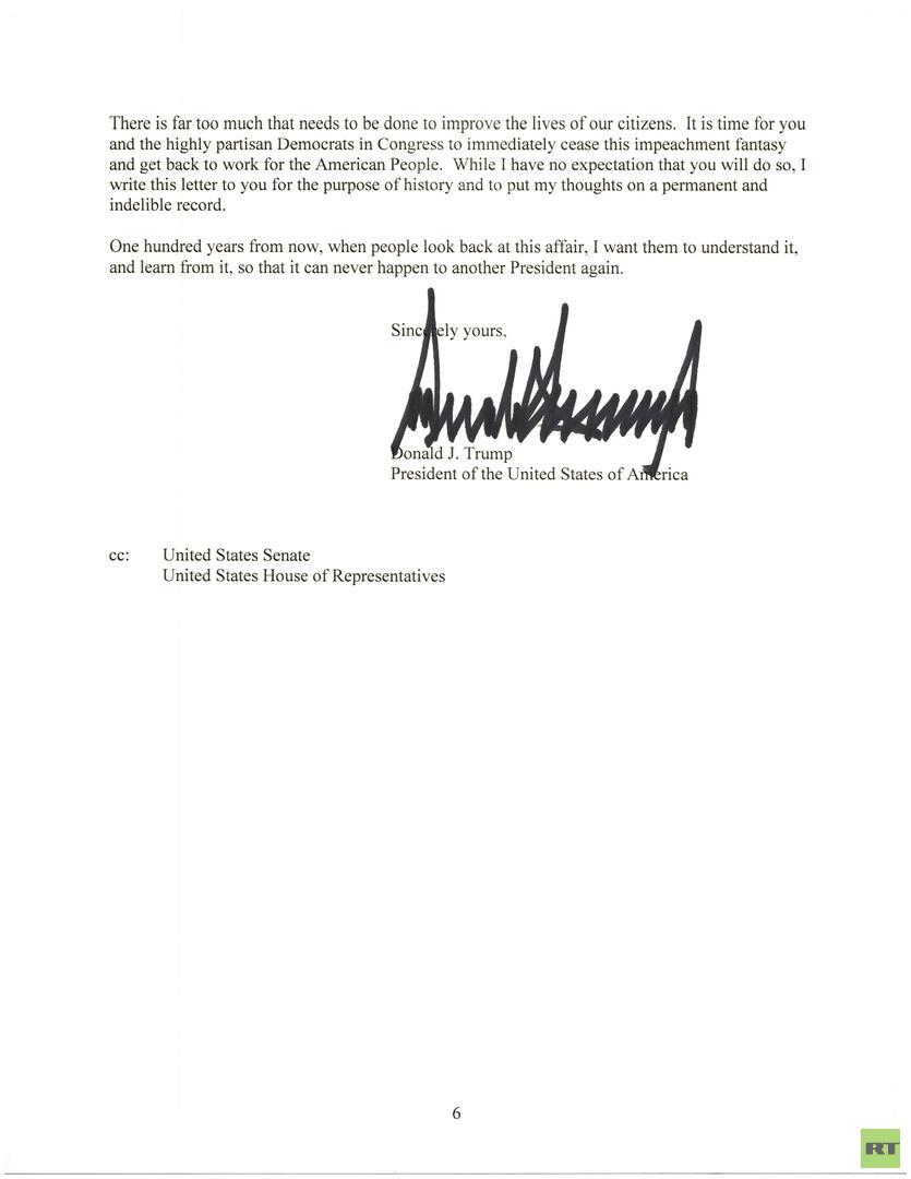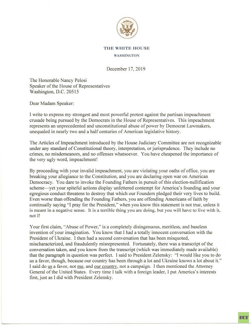 وجاءت رسالة ترامب التي نشرت على موقع البيت الأبيض قبل يوم واحد من نقاش في مجلس النواب حول الموافقة على مواد المساءلة ضد ترامب.
