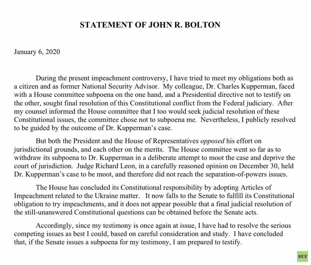 أصدر مستشار الأمن القومي الأمريكي السابق جون بولتون اليوم الاثنين بيانا، أكد فيه استعداده للإدلاء بشهادته في مجلس الشيوخ بشأن عزل الرئيس الأمريكي دونالد ترامب.