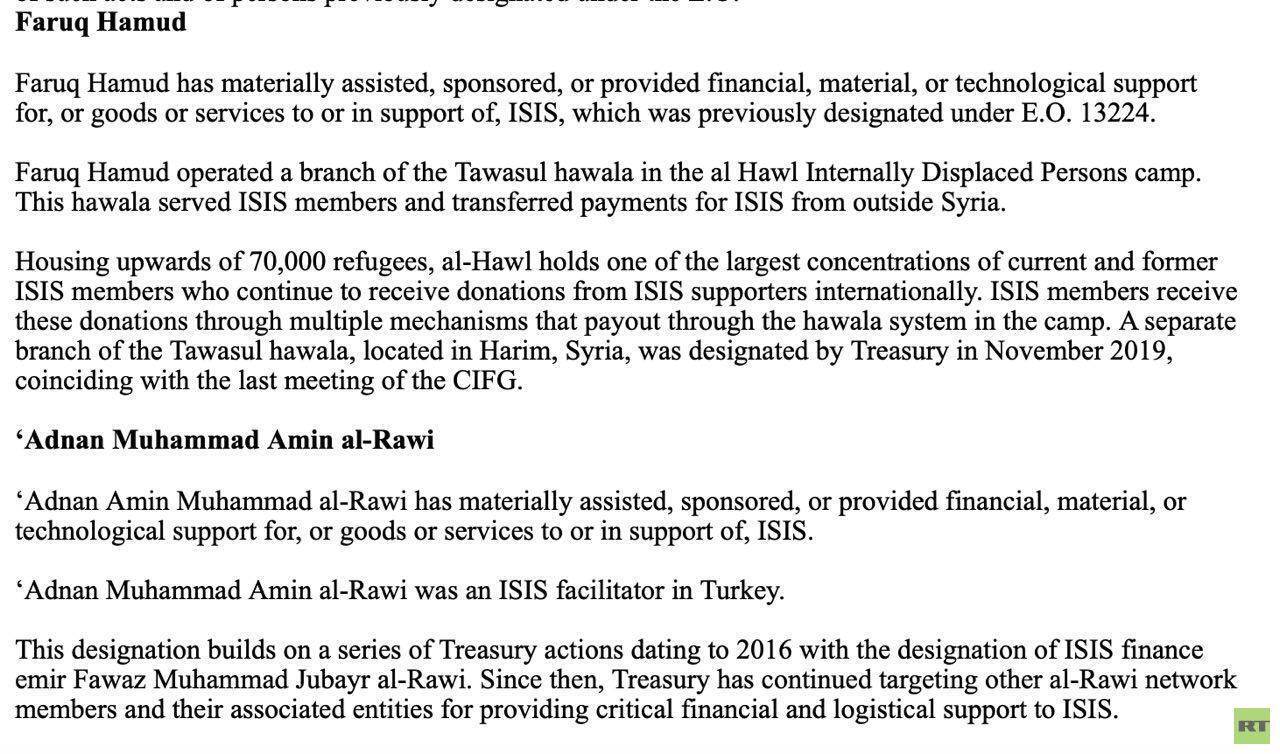 ووفقا لبيان الوزارة، فإن المدعو فاروق حمود، أحد المعنيين بالعقوبات، أشرف على فرع لشركة تحويل أموال، وقدم دعما ماليا وماديا وتقنيا لتنظيم "داعش"، كما ساهم في تسهيل عمليات نقل الأموال لعناصر التنظيم من خارج سوريا.