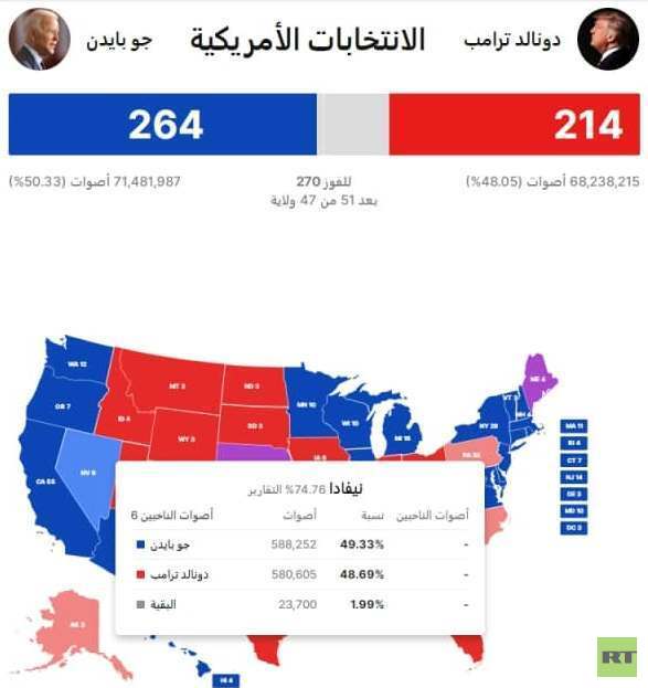 ويكفي لبايدن الفوز بولاية نيفادا التي تمثل 6 أصوات في المجمع الانتخابي، للحصول على 270 صوتا علما أن رصيد الرئيس ترامب توقف عند 214 صوتا.