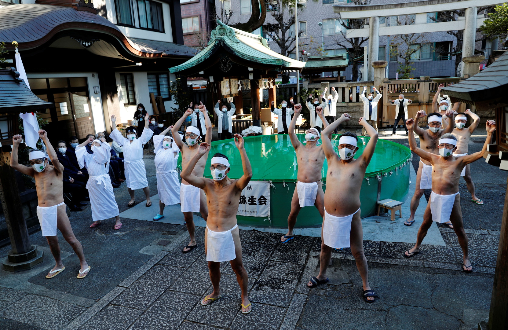 شهدت طوكيو، اليوم الأحد، أحد طقوس ديانة شينتو، وهو النزول إلى حمام مياه مثلجة طلبا لنقاء الروح والصلاة من أجل انتهاء فيروس كورونا.