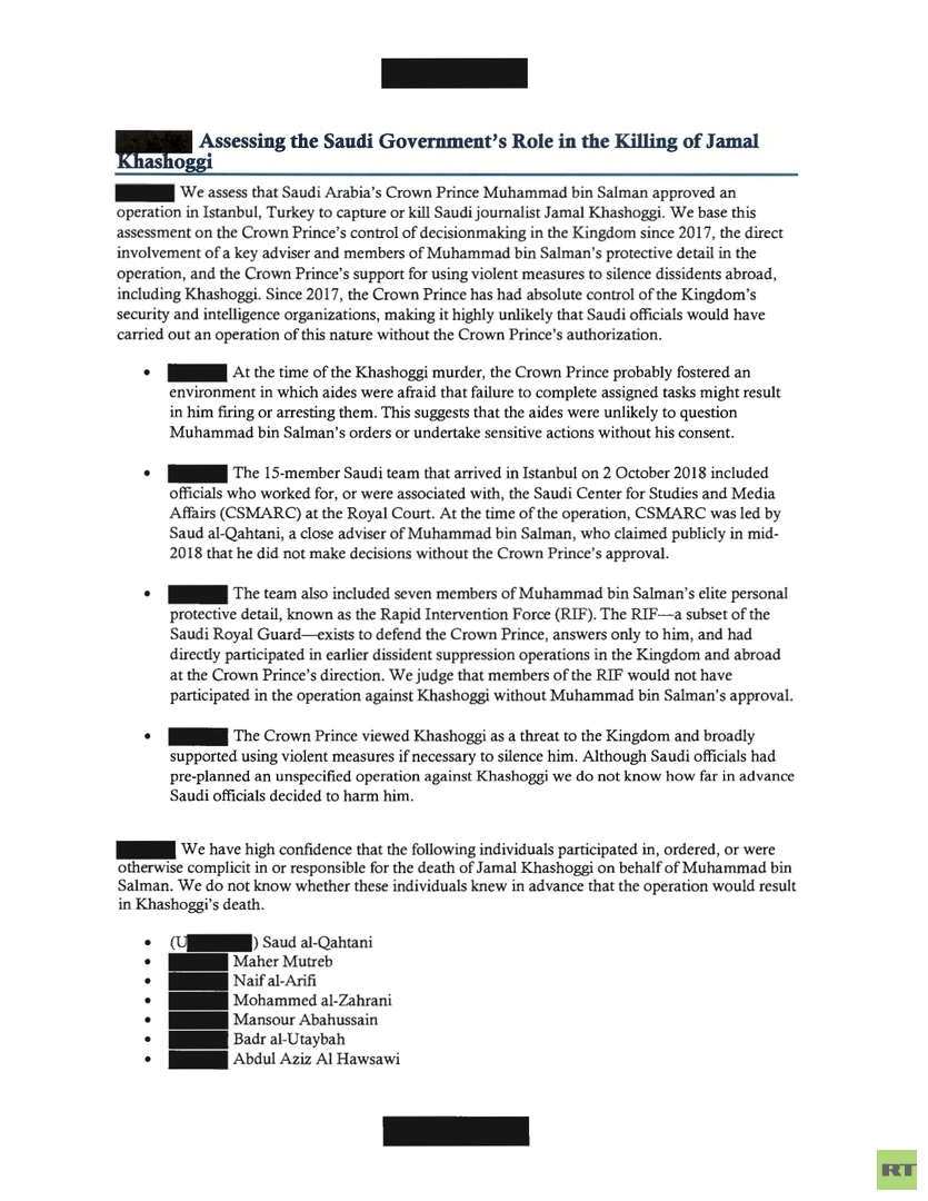 جدير بالذكر أن التقرير الذي رفعت عنها السرية وأصدرته إدارة الرئيس الأمريكي جو بايدن، أدرج 21 فردا، لدى المخابرات الأمريكية ثقة كبيرة في أنهم متورطون أو مسؤولون عن مقتل خاشقجي نيابة عن ولي العهد.