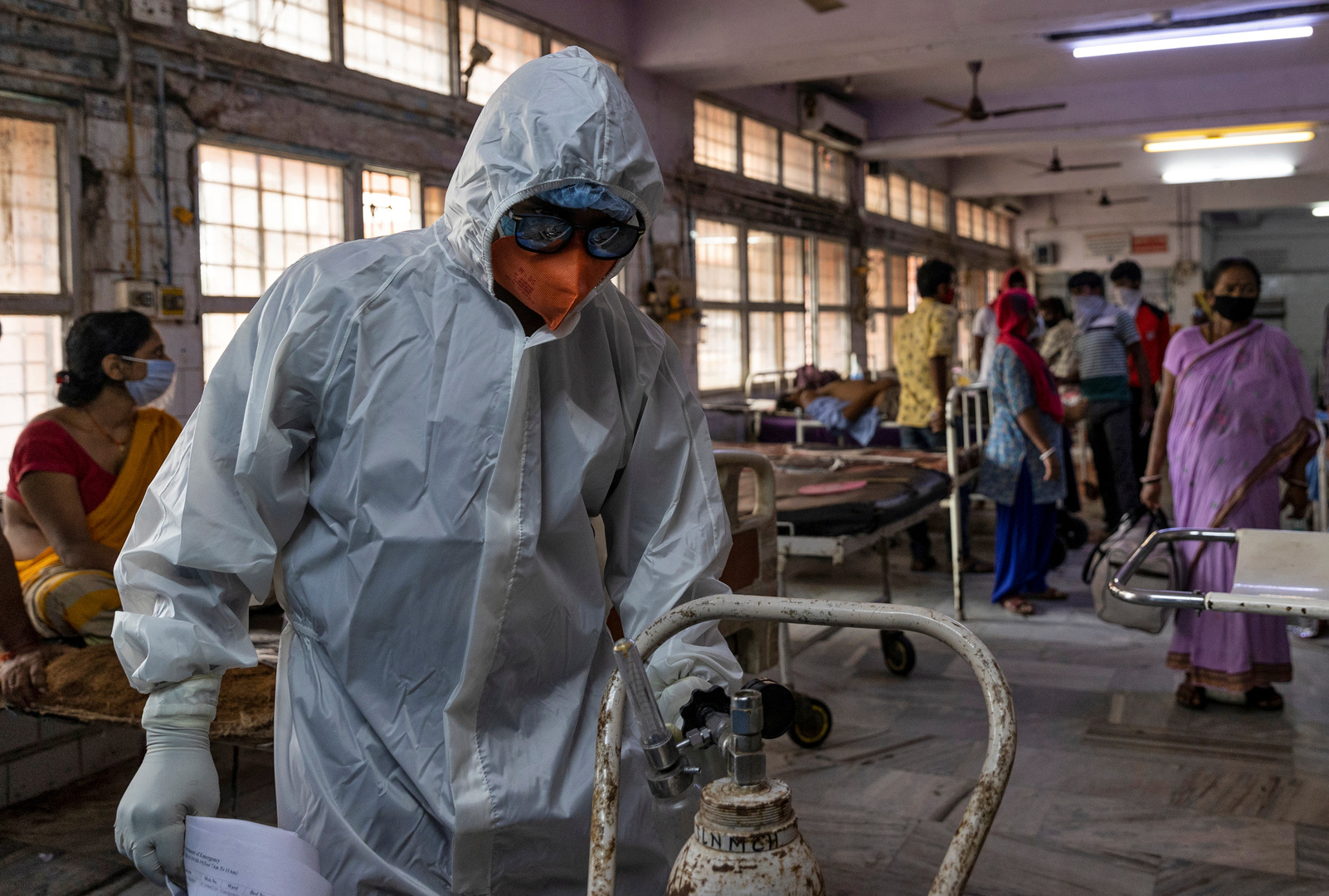 وعرض التلفزيون صورا لأشخاص يحملون أسطوانات أكسجين فارغة تتكدس في منشآت إعادة التعبئة في ولاية أوتار براديش الأكثر اكتظاظا بالسكان وهم يسعون لإنقاذ أقاربهم في المستشفى.