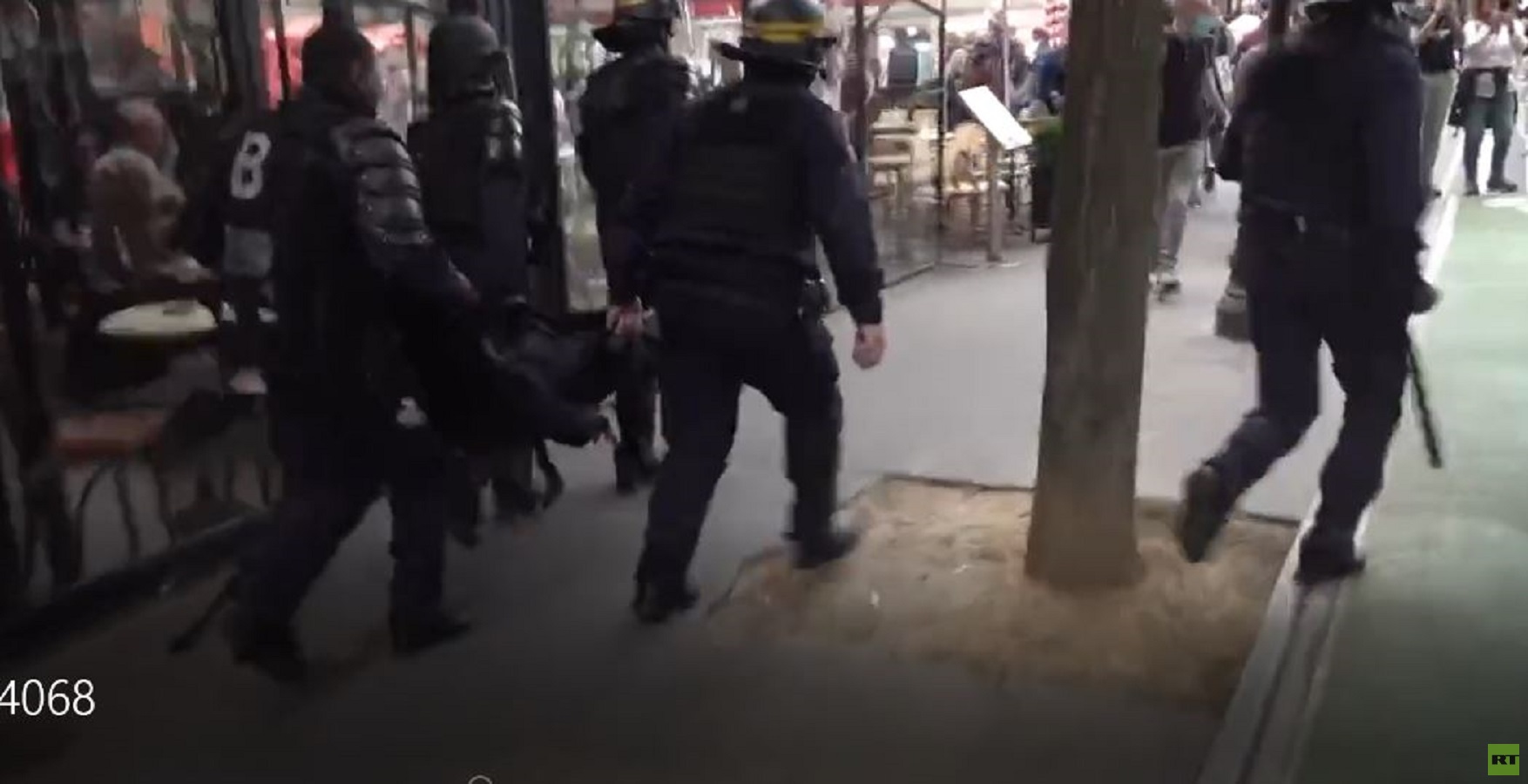 وفي حوالي الساعة االرابعة عصرا تصاعد التوتر بالقرب من ساحة الجمهورية، حيث ردت الشرطة بالغاز المسيل للدموع على إلقاء المتظاهرين المفرقعات باتجاهها وهم يهتفون: "لا للديكتاتورية" أو يغنون نشيد الثورة الفرنسية.