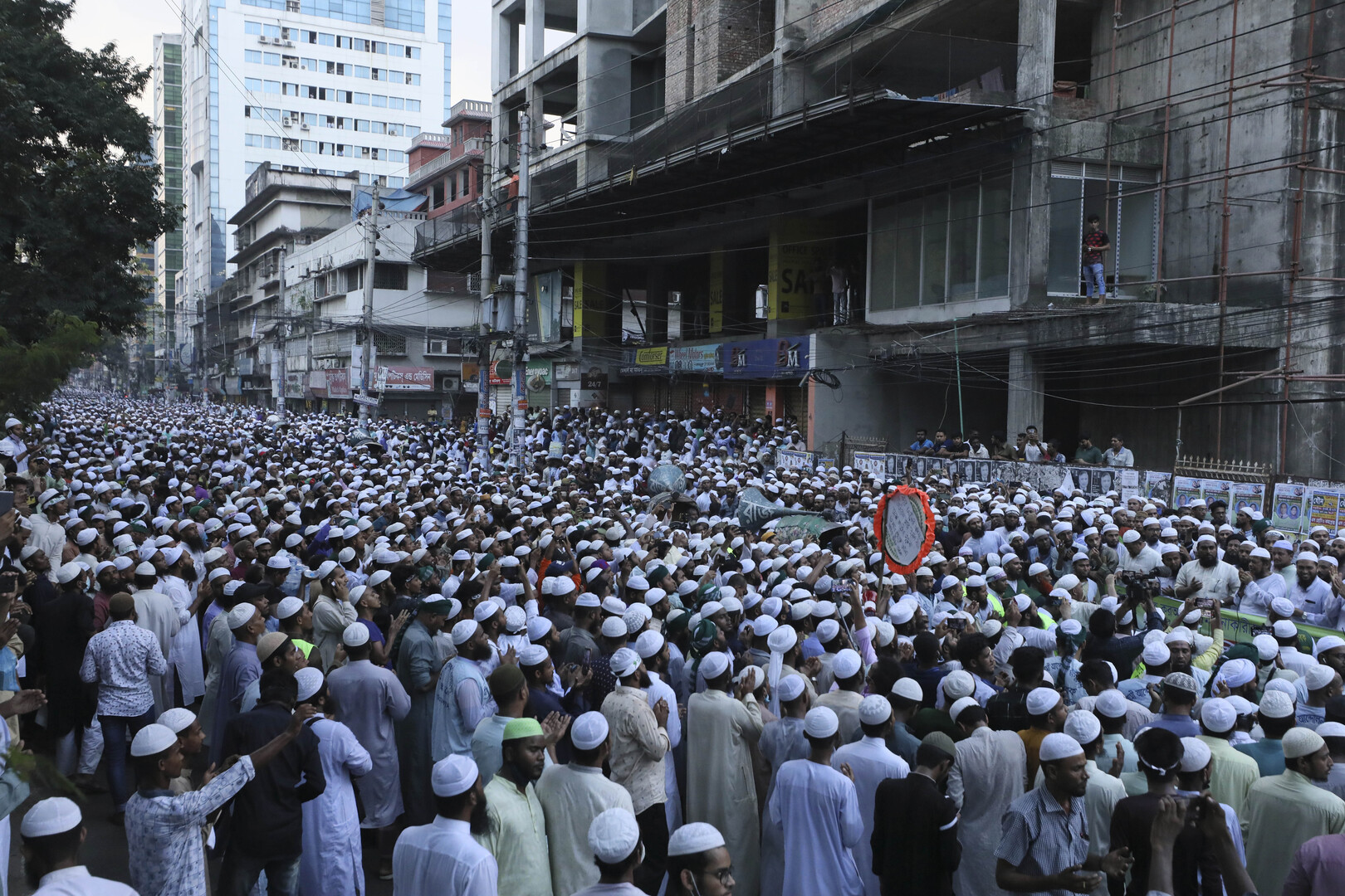 وخرج نحو 10 آلاف متظاهر حمل كثير منهم لافتات لأحزاب سياسية إسلامية إلى الشوارع خارج المسجد الرئيسي بالعاصمة دكا، بعد يوم من انتهاء مظاهرات في نفس الموقع بصدامات مع الشرطة.