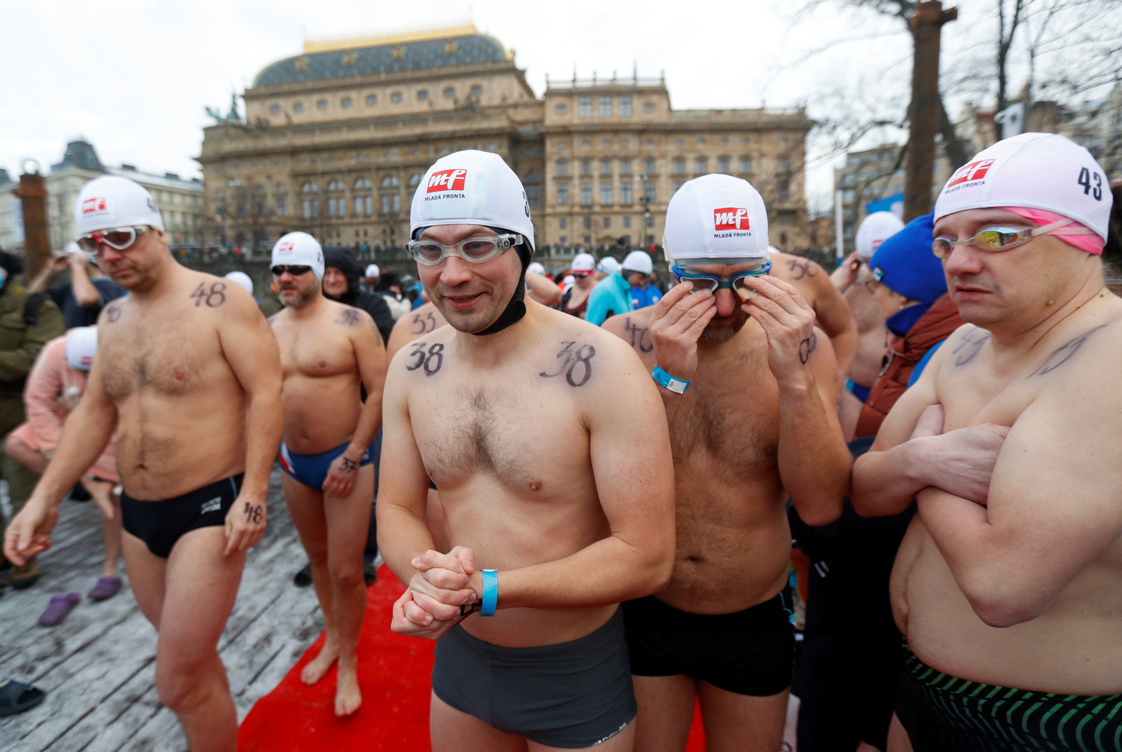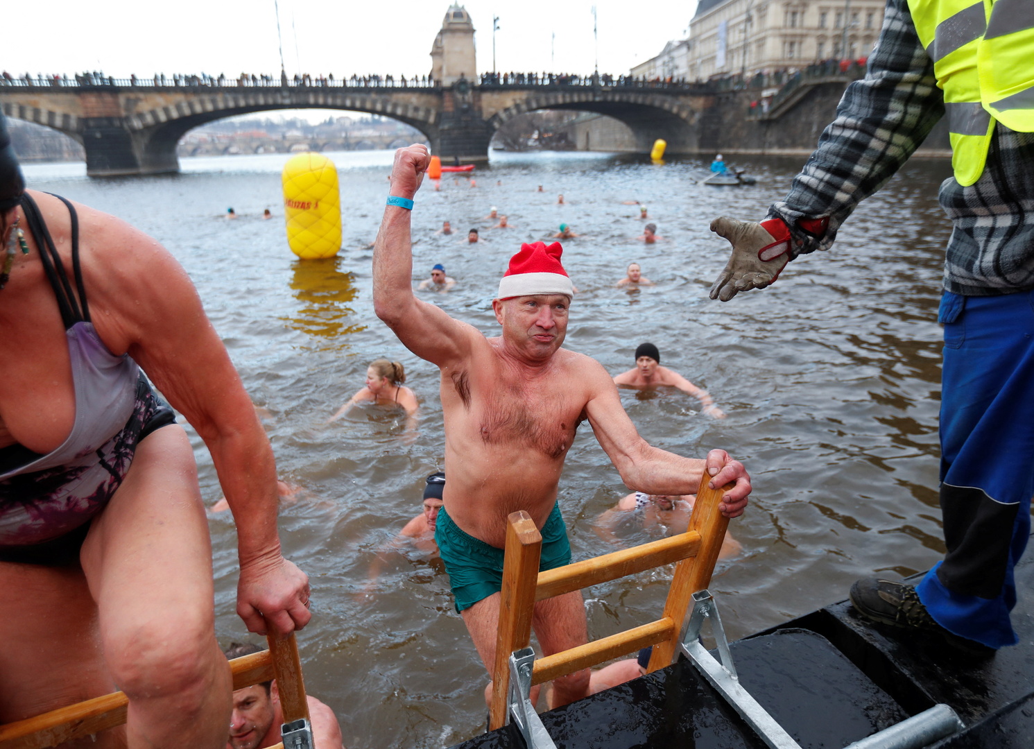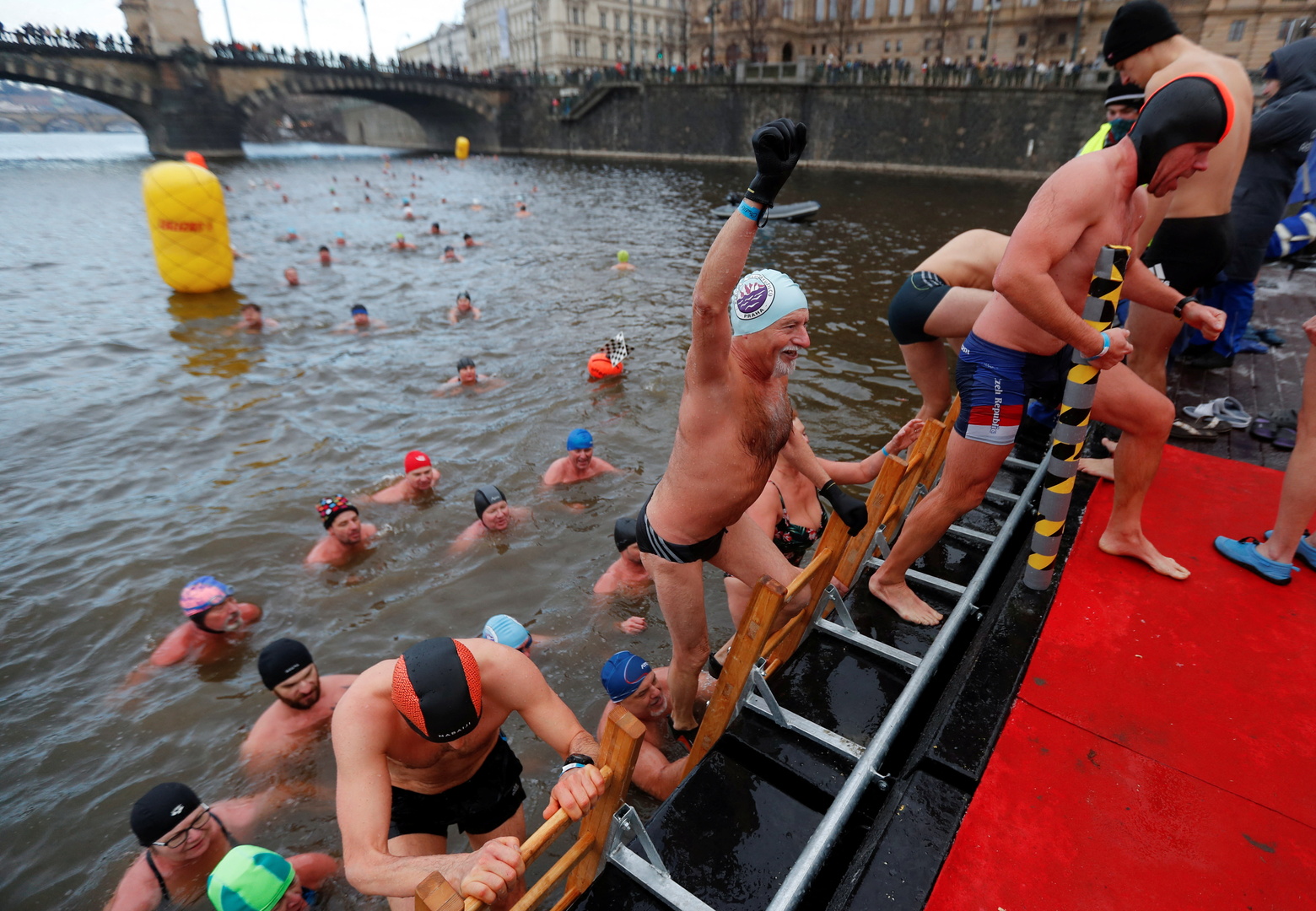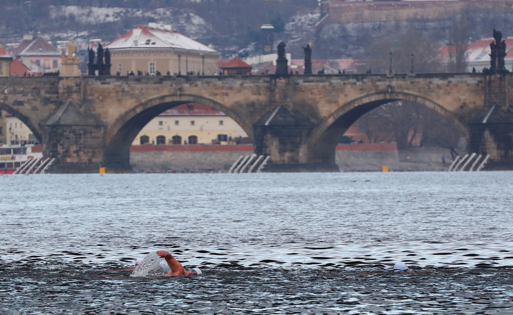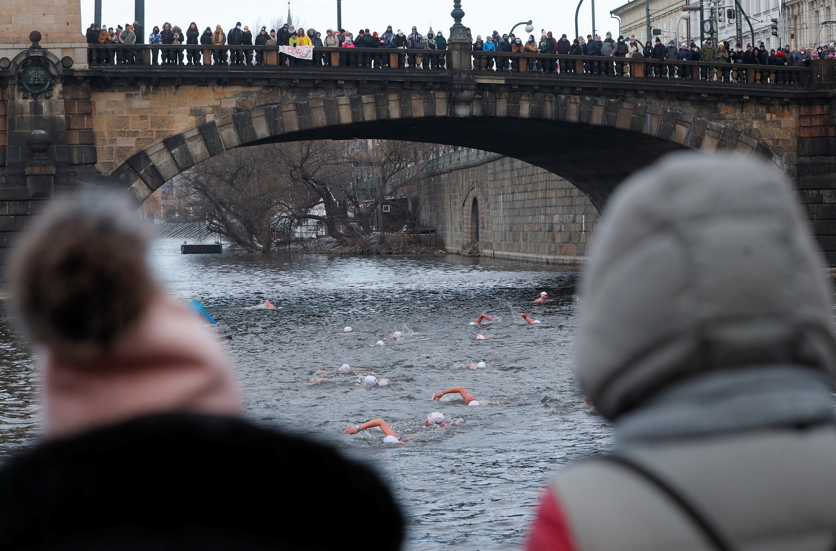 قام العشرات من السباحين الجديين بالسباحة في نهر فلتافا في براغ عاصمة التشيك، في مسابقة تقليدية تنظم سنويا بعطلة عيد الميلاد باردة الأجواء.