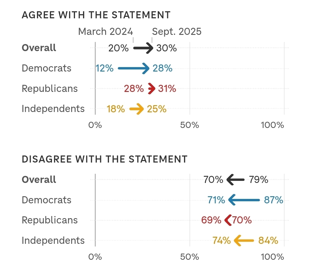 وهذه النسبة تمثل ارتفاعا بـ11 نقطة مقارنة بأبريل 2024، وجاءت الزيادة مدفوعة أساسا بالديمقراطيين، حيث ارتفعت نسبتهم من 12% قبل 18 شهرا إلى 28% اليوم، بينما بلغت بين الجمهوريين 31% بزيادة ثلاث نقاط، وارتفعت بين المستقلين من 18% إلى 25%.