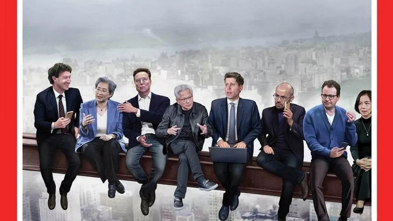 ويضم الغلاف المصمم على غرار الصورة الشهيرة "الغداء على ناطحة سحاب"، زوكربيرغ، وماسك، وألتمان، ومدير عام شركة إنفيديا جينسن هوانغ، الرئيسة التنفيذية لشركة AMD ليزا سو، وديميس هاسابيس مدير عام شركة AMD المملوكة لشركة غوغل والمتخصصة في مجال الذكاء الاصطناعي، ومدير عام شركة Anthropic داريو أمودي، وفاي فاي لي التي قامت بتأسيس شركة ImageNet، وجميعهم يجلسون على عارضة فولاذية فوق المدينة.