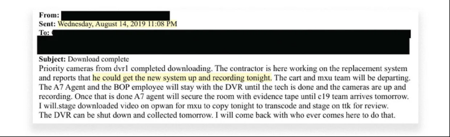 أطلق مكتب التحقيقات الفيدرالي (FBI) تلك اللقطات هذا الصيف، ووجد تحليل أجرته شبكة "سي بي إس نيوز" (CBS News) أن اللقطات لم توفر رؤية واضحة بما يكفي لإثبات عدم دخول أي شخص إلى منطقة زنزانة إبستين بشكل قاطع، كما كانت هناك تناقضات أخرى مع التصريحات الرسمية ومقابلات الشهود. ورفضت وزارة العدل ومكتب التحقيقات الفيدرالي التعليق في ذلك الوقت.