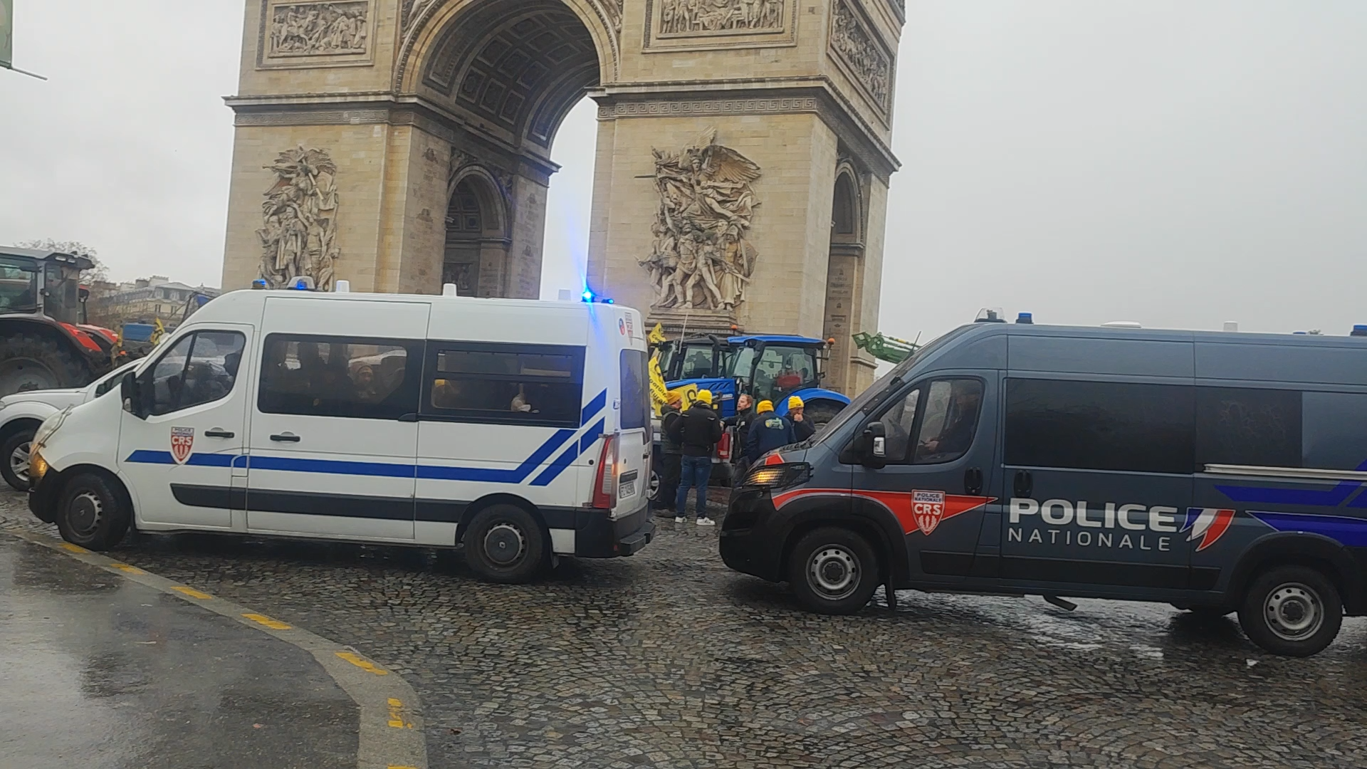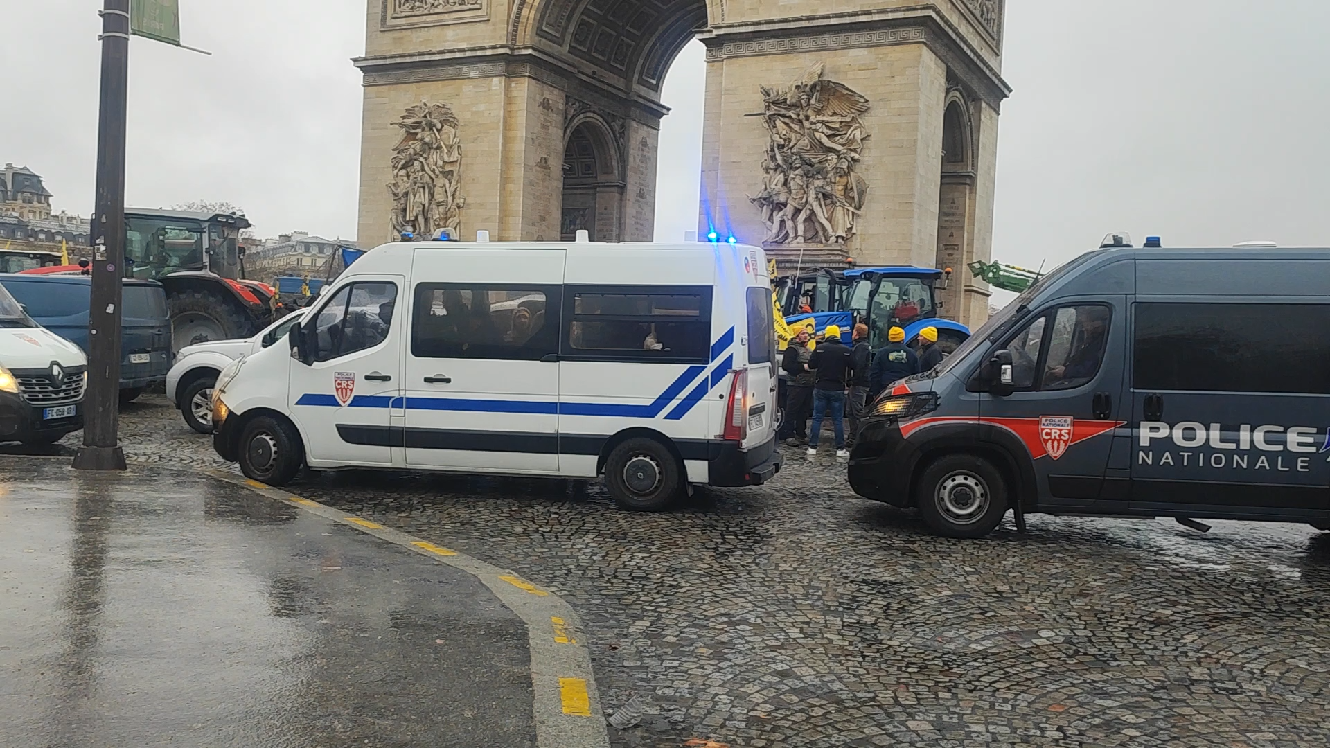ووثقت عدسة RT وصول المزارعين الفرنسيين إلى قوس النصر، ووثقت المشاهد انتشارا كثيفا لقوات الأمن وسط أزمة مرورية خانقة.