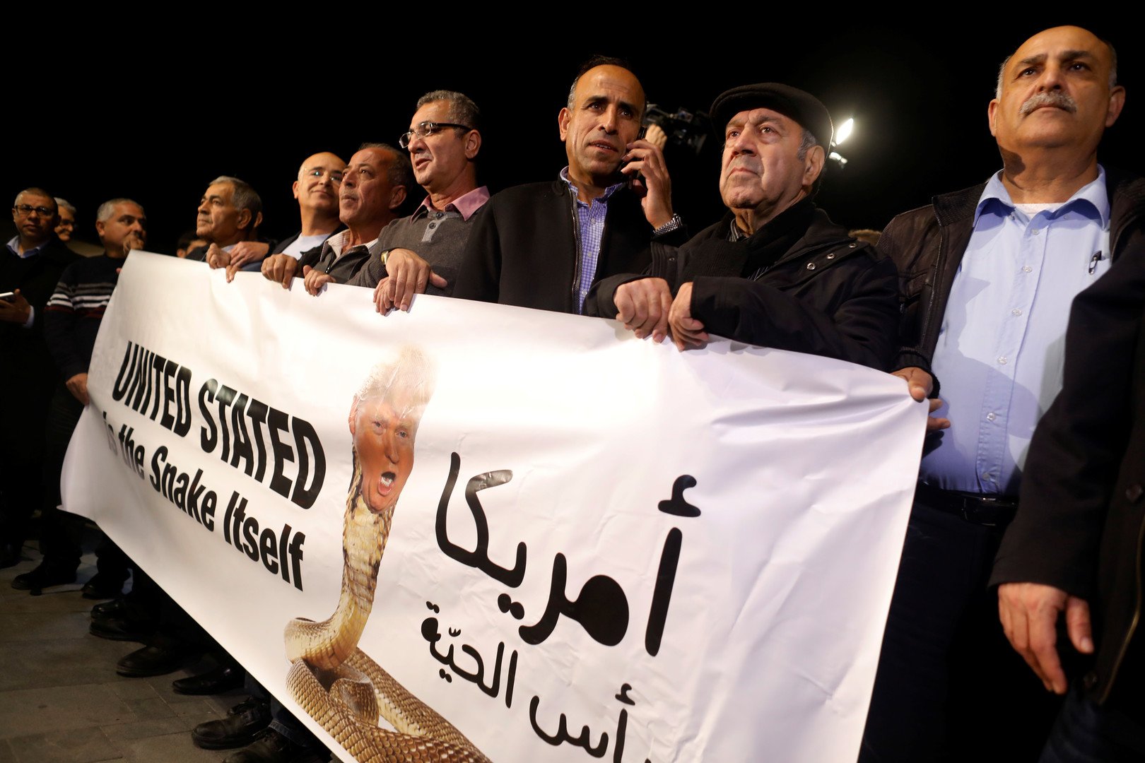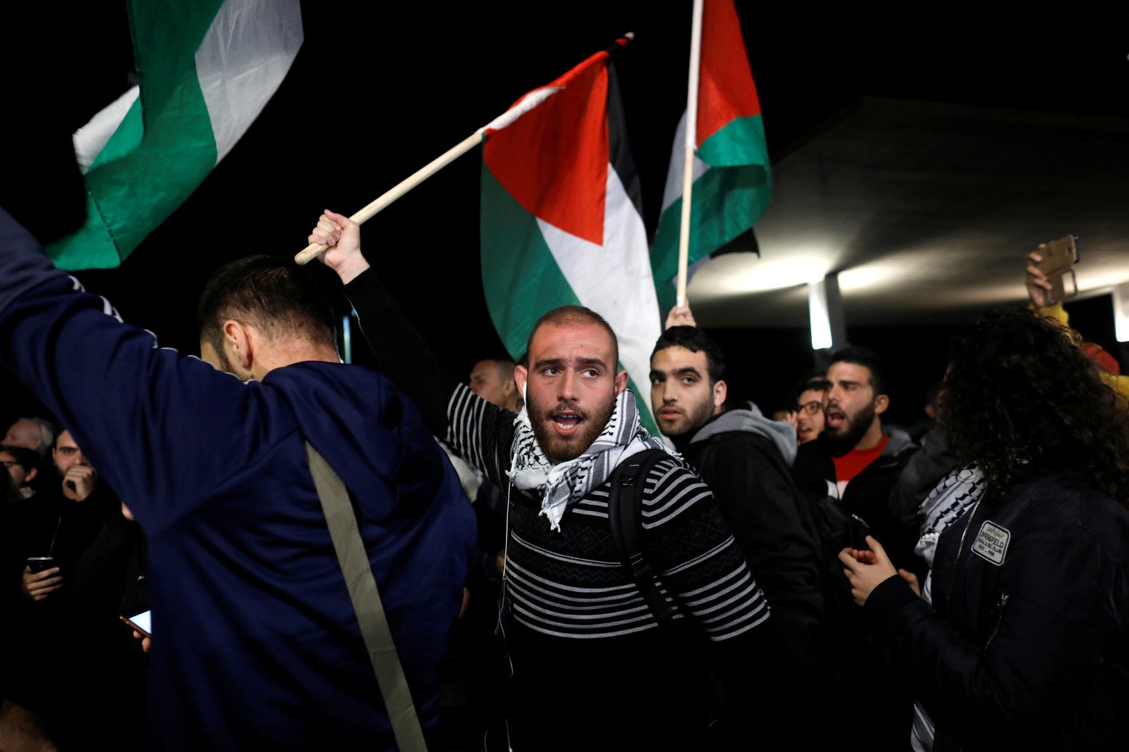 خرج المئات من فلسطينيي الخط الأخضر ونشطاء يهود من اليسار في مظاهرة أمام السفارة الأمريكية في تل أبيب، احتجاجا على قرار ترامب الاعتراف بالقدس عاصمة لإسرائيل.