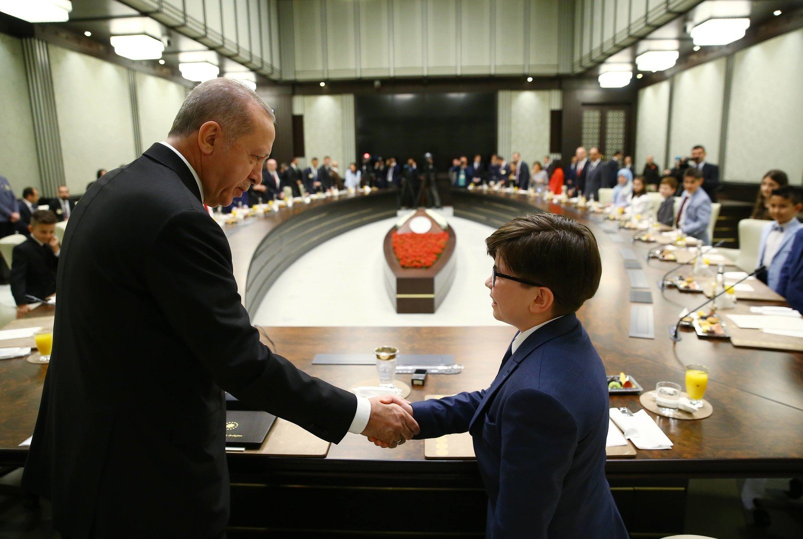 وصافح أردوغان الأطفال لدى دخولهم القاعة، ورحب بالتلميذ فاتح، الذي يدرس في الصف السادس، وحل محل الرئيس رمزيا.