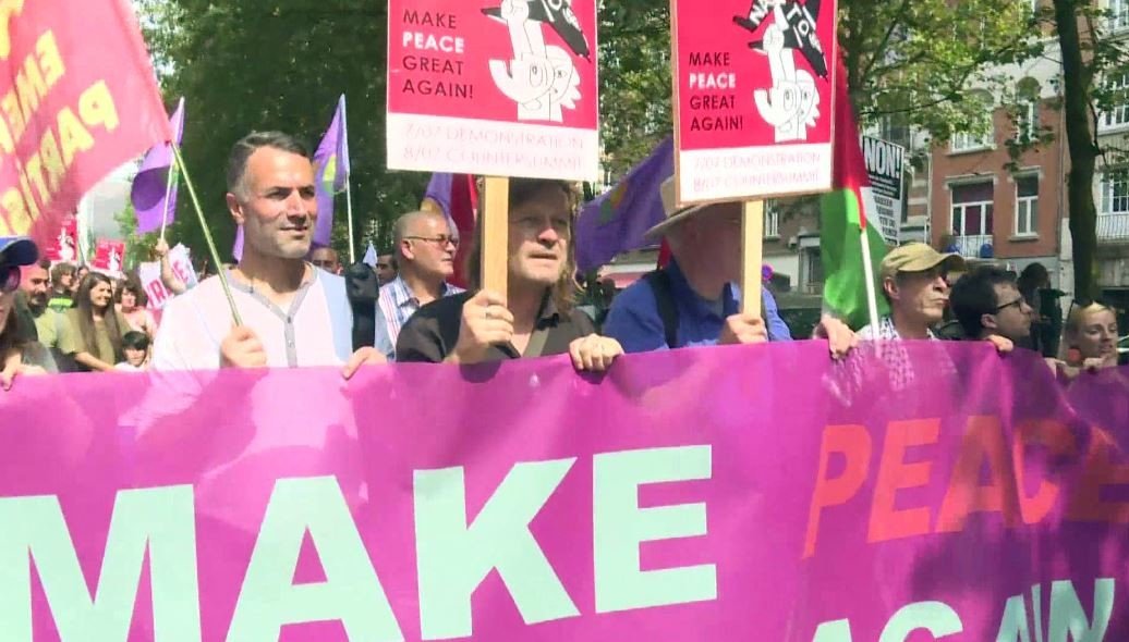 تظاهر مئات الأشخاص في بروكسل من أجل السلام وضد سياسة الرئيس الأمريكي دونالد ترامب، وذلك قبل أيام من مشاركته في قمة لحلف شمال الأطلسي في العاصمة البلجيكية.